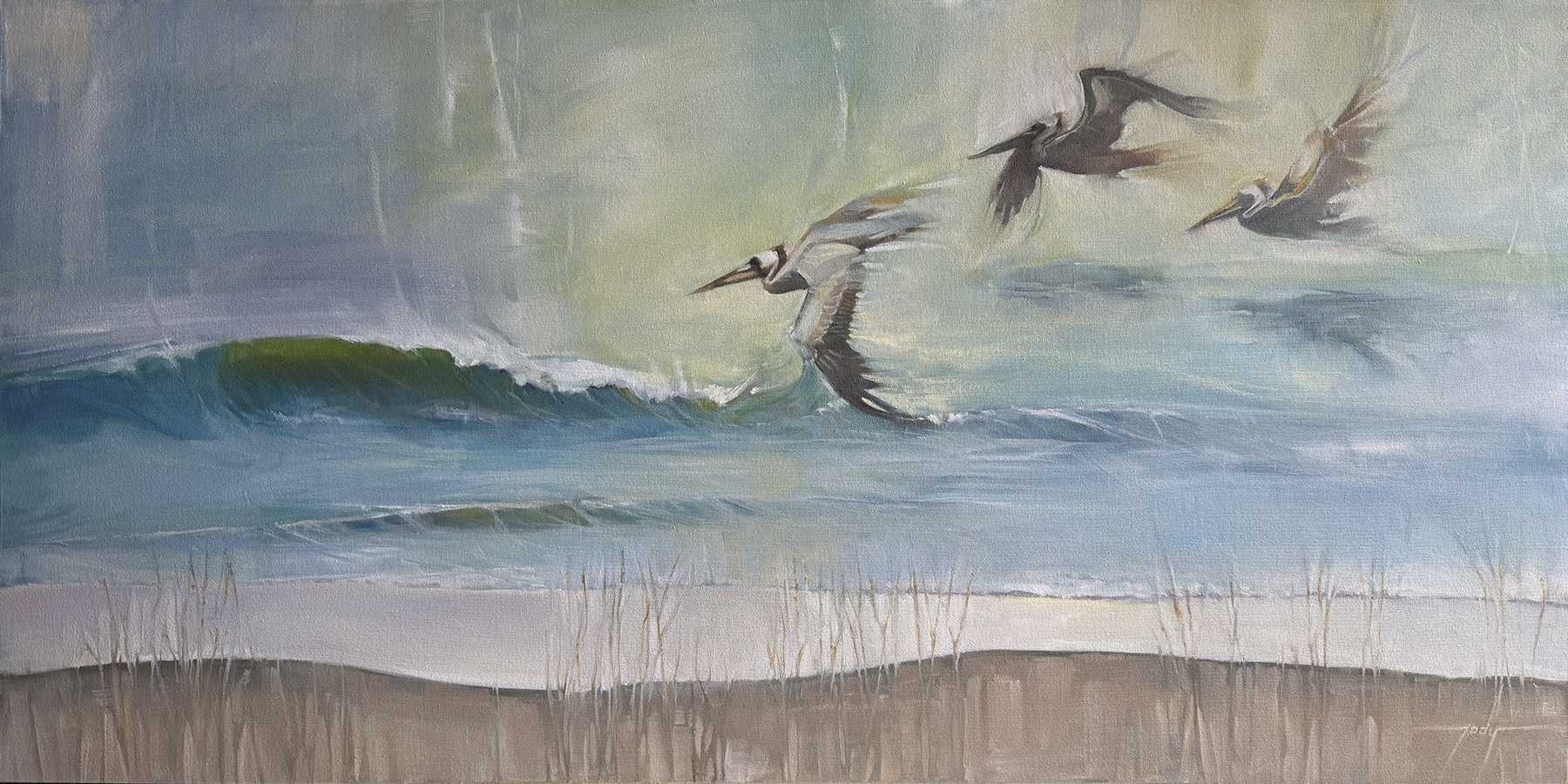Then she showed the painting to my mom. And my mom disagreed with almost everything. My mom is not an artist but she is definitely a consumer of art and an honest critic of my work. Maybe I should use the word “fantastic” for her more often. She also loved the new treatment of the pelicans—but unlike my daughter, she really liked the textured background. She felt the color palette was a clear improvement. What my daughter experienced as interruption, my mom experienced as richness. She didn’t understand why my daughter was distracted by the horizontal waterline.